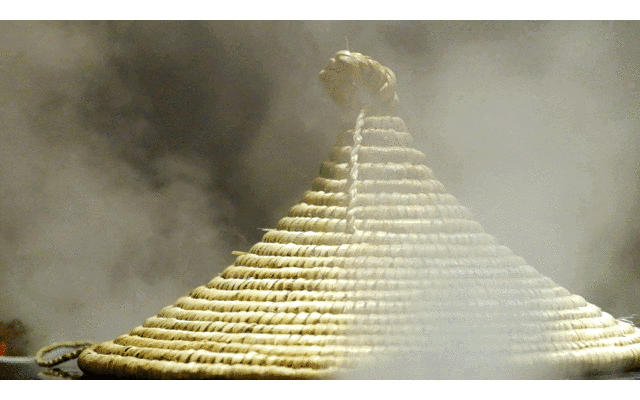 以石头为锅、草帽为盖、蒸汽为火进行制作,