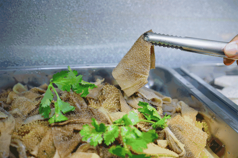【鲜毛肚】毛肚永远是火锅撸串必不可少的菜品,新鲜的毛肚都是色泽明亮,把一整串放入翻滚的红油锅里,滚动十秒左右取出,先撸到盘子里,然后一片片放进嘴里,嚼劲十足。