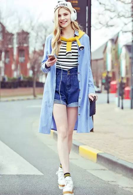 条纹T恤搭配牛仔翻边短裤是经典的搭配,
