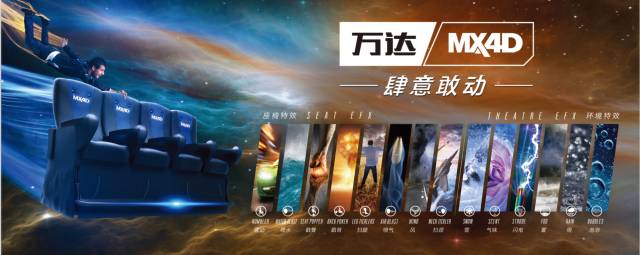 MX4D通过将座椅运动、震动、刮风、闪光、烟雾、气味等十余种特效与影片情节完美结合的方式,帮助观众更好地融入影片,体验到身临其境看电影的非凡娱乐享受。