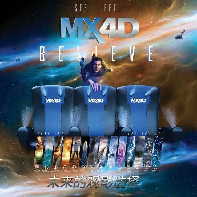 MX4D是由美国MEDIA MATION公司开发的具有革命性意义的4D影院技术。与传统的放映技术相比,MX4D技术通过座椅的运动及拟真特效带领观众进入“真实”的电影场景,“亲身”体验影片剧情,令电影体验不再仅仅局限于传统的“看”和“听”。