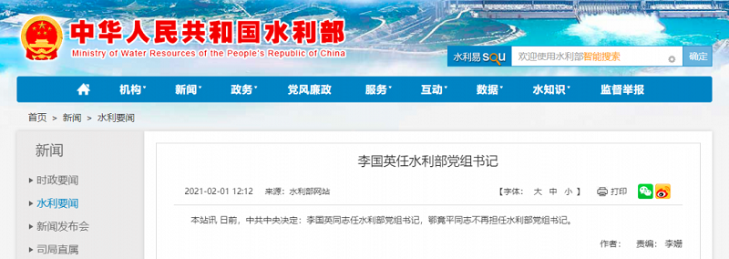 安徽省省长李国英任水利部党组书记 鄂竟平不再担任