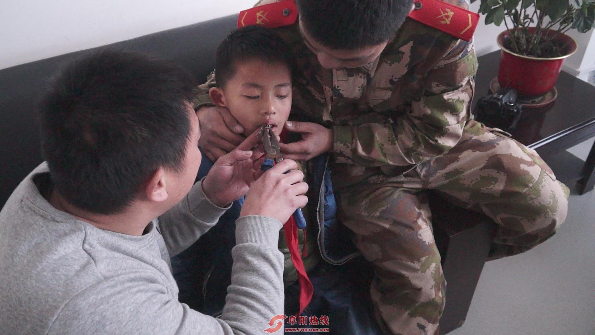 在仔细查看被卡位置后,中队官兵发现钥匙链卡住小孩嘴唇的部位不是太深,立即带领伤者到中队部展开施救,1分钟后中队官兵成功用螺丝刀、尖嘴钳去除了小孩口中的拉链。
