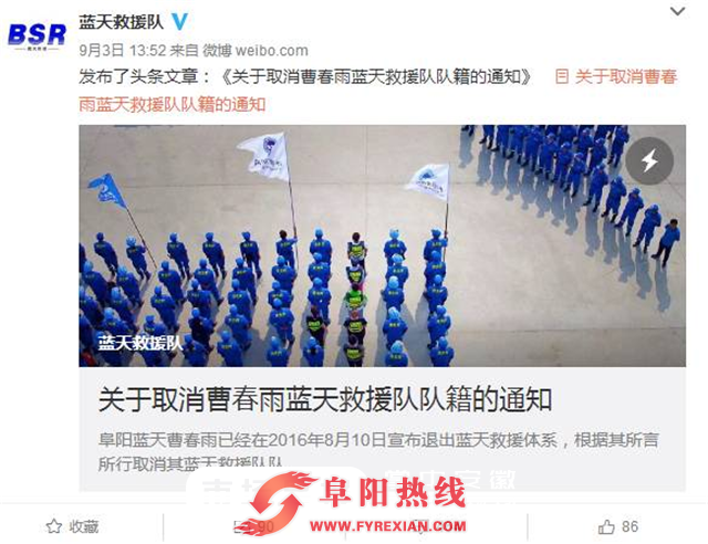 安徽财经网讯:9月3日,认证为蓝天救援队官方微博的@蓝天救援队 在新浪微博上发布了一篇头条文章,这篇题为《关于取消曹春雨蓝天救援队队籍的通知》的文章矛头直指著名公益人士“老仔” 曹春雨和他的阜阳蓝天救援队。文章发布后,立刻在全国公益圈中引发了强烈关注。为了还原事实真相了解事情的原由,市场星报、安徽财经网记者联系并独家采访了老仔。