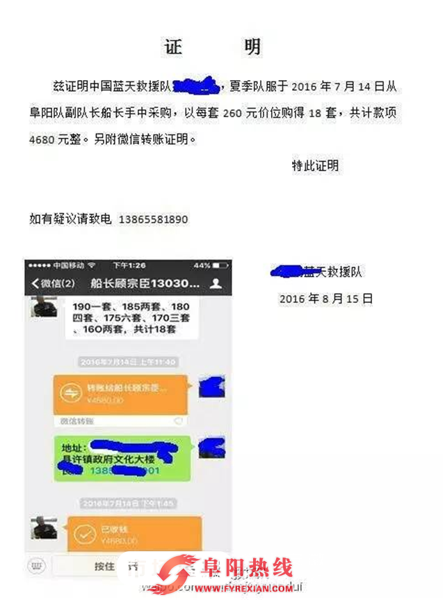 图为蓝天救援队发布的阜阳蓝天救援队加价卖服装证据截图