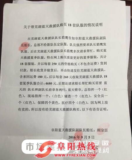 至于加价卖服装一事,老仔说他之前压根不清楚怎么回事,后来看到这个文章后一打听才知道真相,原来竟然是因为北京蓝天救援总队的人不卖给刚刚成立的芜湖救援队队服,芜湖救援队的队长以前就是阜阳蓝天救援队的主力,于是他就委托阜阳救援队的队员,在网上以250元一套的价格为芜湖救援队买了18套衣服,加上180元的邮递费,正好合260元一套,于是被说成了高价倒卖服装。老仔气愤地说,“这完全是芜湖救援队被逼无奈,阜阳蓝天救援队的队员出于兄弟感情,帮忙在网上买的队服,哪来的高价倒卖服装一说呢?”。