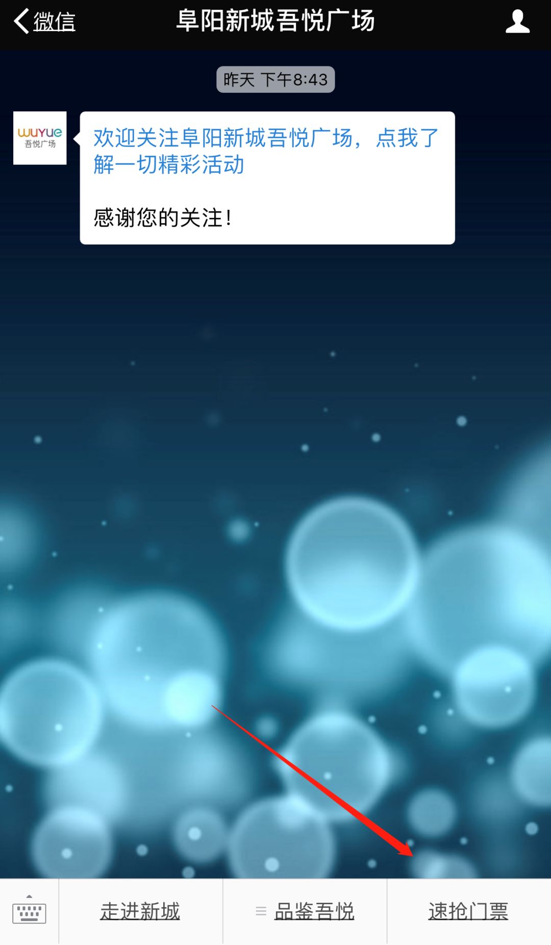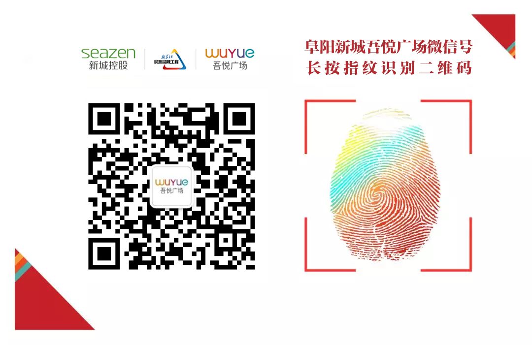 1、扫描二维码,关注“阜阳新城吾悦广场”微信公众号