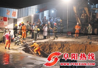 塌陷发生后,多台消防车、救护车、挖掘机参与搜救。21日11时40分许,事故现场突降大雨,由于塌陷处正下方是一条暗渠,雨水不断注入大坑,救援被迫暂停,12时30分左右,雨势减弱,消防队员又继续展开搜救。